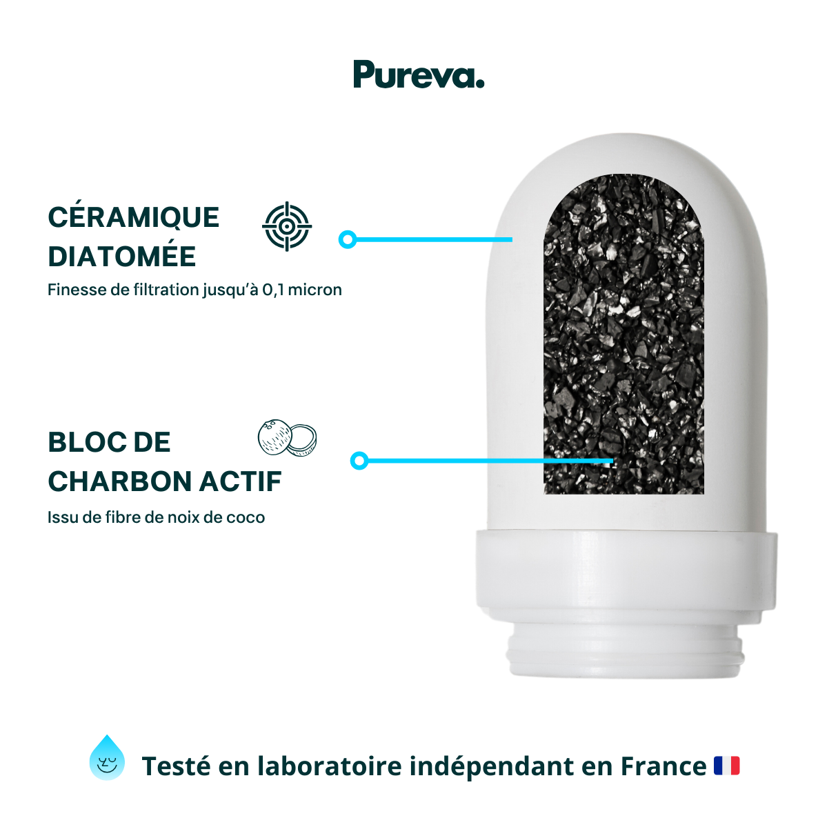 Les tests réalisés en laboratoire démontrent que le filtre Pureva réduit efficacement ces résidus grâce à l’action combinée du charbon actif et de la céramique diatomée. Cette technologie avancée permet d’éliminer des composés préoccupants comme l’ibuprofène, le bisphénol A et certains pesticides, offrant ainsi une eau plus saine et plus respectueuse de votre bien-être.
